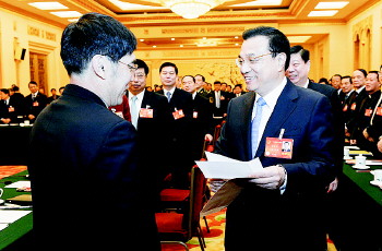 中共中央政治局常委、国务院总理李克强6日上午来到他所在的十二届全国人大二次会议山东代表团,同代表们一起审议。