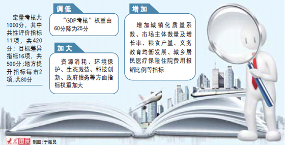 为真正体现对各市科学发展的引领作用,这次对考核指标的设置和权重作了很大调整,增加了税收占公共财政收入比重及提高幅度、城镇化质量系数、市场主体数量及增长率、粮食产量、义务教育均衡发展、城乡居民医疗保险住院费用报销比例等多项指标。在定量考核中,仍然实行千分制,即总分为1000分,但对各项指标的权重作了大幅度调整,加大了资源消耗、环境保护、生态效益、科技创新、安全生产、政府债务等方面指标的权重,更加重视教育文化、劳动就业、居民收入、群众健康。例如,备受关注的“GDP考核”,即“地区生产总值增长目标实现程度”指标,权重由前些年的60分降低为25分。