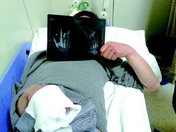 在医院病房,韩先生展示他的断指X光片。本报记者 王兴飞 摄