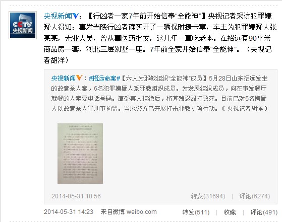 【行凶者一家7年前开始信奉“全能神”】央视记者采访犯罪嫌疑人得知:事发当晚行凶者开的保时捷卡宴车主为犯罪嫌疑人张某某,无业人员,曾从事医药批发,这几年一直吃老本。在招远有90平商品房一套,河北别墅一座。7年前全家开始信奉全能教,事发时认为受害人是“邪灵恶神”要打死她。