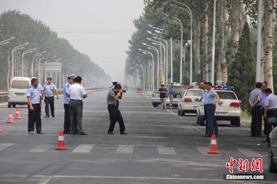 8月20日上午8时30分左右,山东龙口发生公交车纵火事件,致1人死亡,19人受伤。现场目前恢复平静,事发公交车已被拖走,地上有明显的火烧痕迹,现场仍能闻到烟味。图为警方在现场勘查。张玉雷 摄