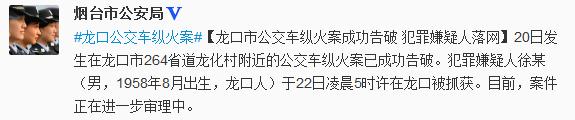 中新网8月22日电 据烟台市公安局官方微博消息,20日发生在龙口市264省道龙化村附近的公交车纵火案已成功告破。犯罪嫌疑人徐某(男,1958年8月出生,龙口人)于22日凌晨5时许在龙口被抓获。目前,案件正在进一步审理中。