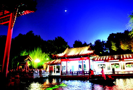 9月6日,一场赏月晚会在济南趵突泉边举行,庆祝泉水复涌11周年。市民代表和游客一起欣赏泉边月色及民俗表演。