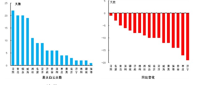 据统计,8月份,“蓝天白云,繁星闪烁”天数最多的城市是日照,为22天,最少的是淄博,为1天。17城市“蓝天白云,繁星闪烁”天数同比均减少,减少最少的是日照,为22天,减少1天;减少最多的是济宁,为2天,减少19天。省会济南为6天,排名第8名。