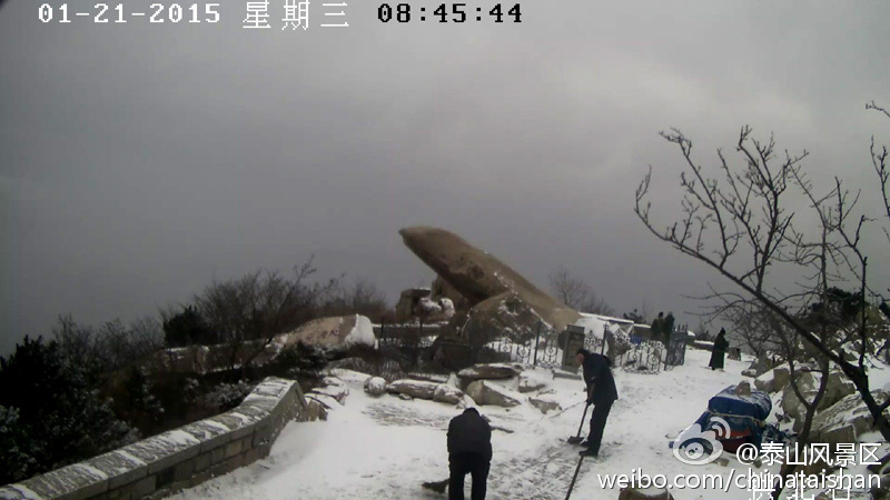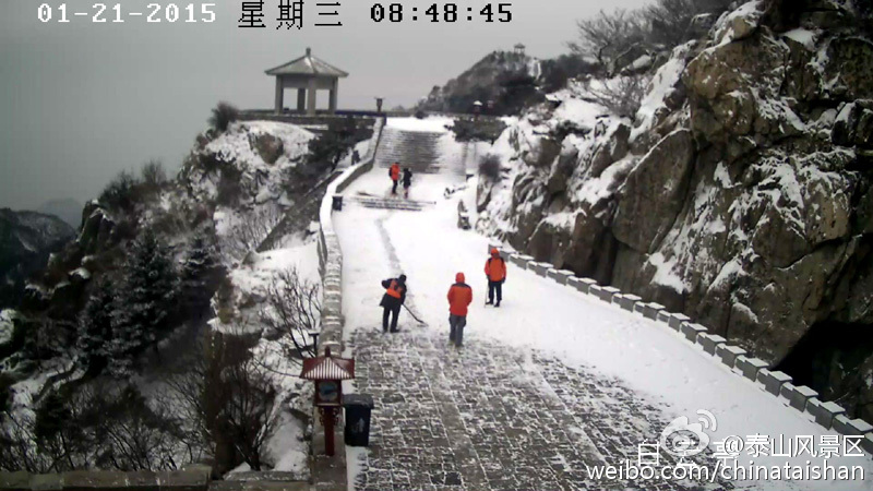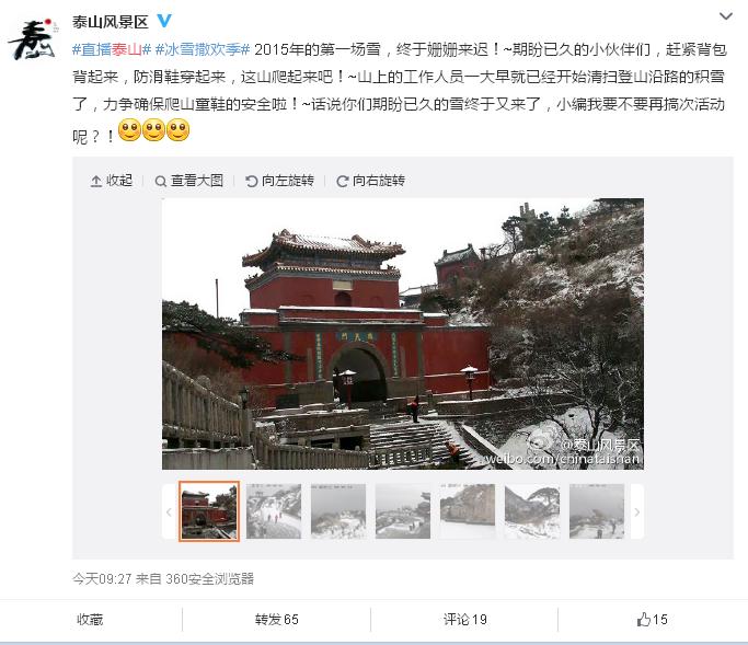 鲁网1月21日讯(记者鲁珊珊)济南的第一场雪在期盼中迟迟未来,山东泰安却先下起了雪,让济南的小伙伴们格外羡慕。@泰山风景区今天上午9:27在微博中发出了7张泰山雪景照片,并且惊呼:“2015年的第一场雪,终于姗姗来迟!”。