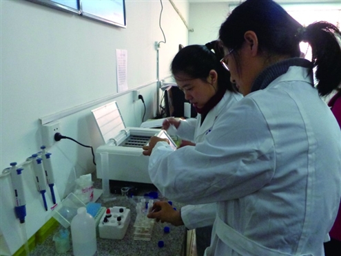 工作人员在对抽取的样本进行检测 记者李雨摄