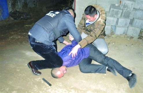 天慢慢暗下来,一路民警守候在某医院家属区内,山西两名男子正待乘车外出,民警趁其不备先后将他们控制。与此同时,另一路民警已经将赵某的民房团团围住。赵某似乎嗅到了几分不安,他冲到院内,突然拿起镐头借机翻墙逃跑,民警果断鸣枪示警,赵某只好夺门而出,被民警顺势按倒在地上。