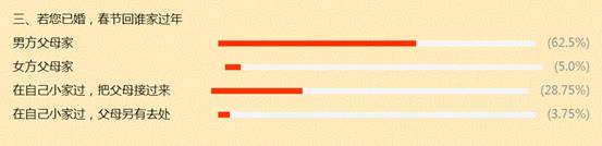 而对于已经有了自己小家的网友,在春节回谁家的问题上,62.5%的网友选择回男方父母家过年,仅有5%的网友选择回女方父母家过年。另有,28.75%的网友选择“把父母接过来,在自己小家过年”。老家菏泽的于女士告诉记者,自从定居济南以后每年都是回丈夫老家临沂过春节,有了孩子后,公公婆婆过来照顾孩子,春节就在自己的小家过春节了。