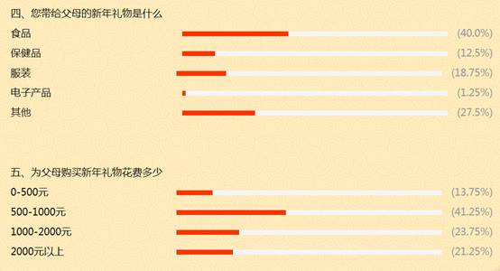 面对琳琅满目的新年礼物,40%多的网友选择了购买食品,其中服装和保健品分别占到了18.75%、12.5%。41.25%网友为父母购买新年礼物花费了500—1000元。超过1000元的网友占到45%,其中2000元以上的超过两成。济南市民王女士今年给爸妈准备了两千块钱的购物卡,“要是直接给他们现金,他们肯定不收,买卡更适合一些。他们拿着想买啥就买啥,大件小件日常生活用品都可以。”家住济南槐荫区的吴先生则是直接陪父母外出旅游来当做新年礼物。