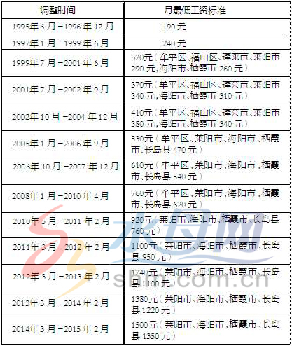 烟台月最低工资标准历次调整情况