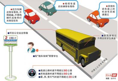 在很多情况下,校车的安全也取决于车辆的行驶速度。因此,山东还拟对校车的最高时速作出限制性规定:载有学生的校车在高速公路上行驶的最高时速不得超过80公里,在其雨雪雾天气校车时速不得超20公里