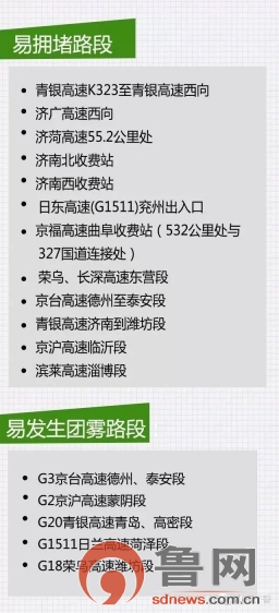 鲁网4月1日讯(记者 王文婷)今天,山东高速交警发布清明假期期间易拥堵路段和易发生团雾路段,交警提醒市民出行要注意查询实时路况,谨慎驾驶。