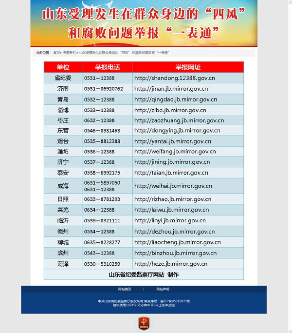 日照市纪委举报电话:0633-8781203;东港区纪委举报电话:0633-8253957;岚山区纪委举报电话:0633-2613091……为扩大问题线索来源,积极依靠和鼓励群众参与正风反腐,日照市纪委开展专项举报行动,公布了18项举报问题,以及市纪委和县区纪委的8部举报电话,发挥社会监督的力量。