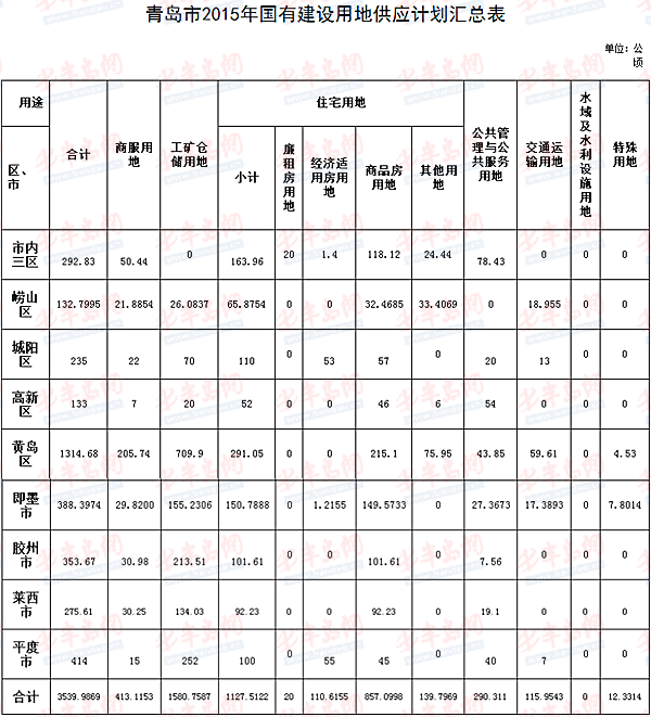 青岛市2015年国有建设用地供应计划汇总表