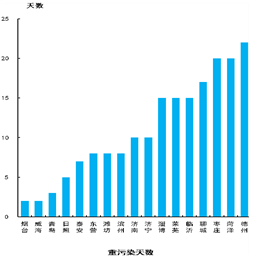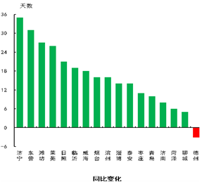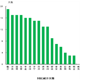 重污染天数(AQI﹥200)最少的是烟台、威海市,为2天,最多的是德州市,为22天。重污染天数同比减少最多的是临沂市,减少19天;威海市同比持平。