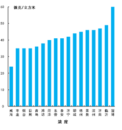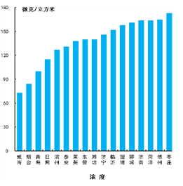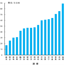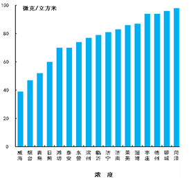 可吸入颗粒物(PM10)浓度最好的城市是威海市,为73μg/m3,最差的城市是枣庄市,为173μg/m3;同比改善幅度最大的城市是烟台市,为17.6%。