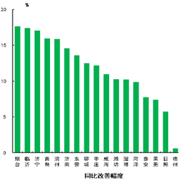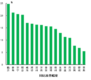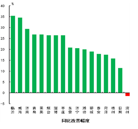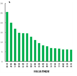 细颗粒物(PM2.5)浓度最好的城市是威海市,为39μg/m3,最差的城市是菏泽市,为98μg/m3;同比改善幅度最大的城市是临沂市,为24.8%。
