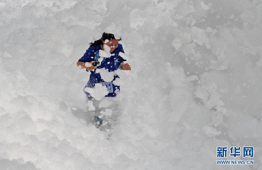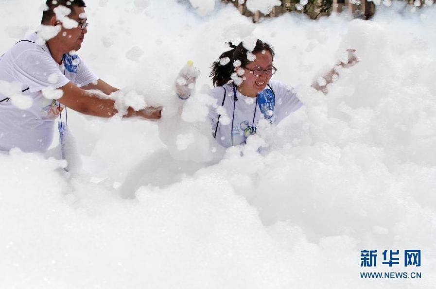 当日,一场“泡泡跑”狂欢活动在山东烟台万达广场举行,数百名市民穿越“泡泡雨”和“泡泡池”,在炎热的天气里体验泡泡带来的快乐和清凉。 新华社发(唐克 摄)