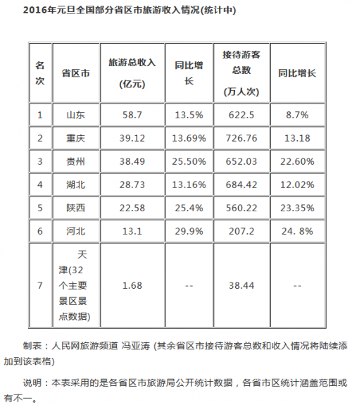 全国部分省份元旦旅游收入公布:山东平均消费最高