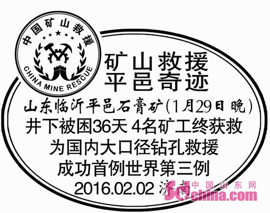 中国邮政集团公司山东省分公司相关工作人员告诉记者,“矿山救援平邑奇迹”纪念邮戳图案呈椭圆形,主图为“中国矿山救援”标志,在醒目的“矿山救援平邑奇迹”大标题下,注以“山东临沂平邑石膏矿(1月29日晚)”、“井下被困36天4名矿工终获救”、“为国内大口径钻孔救援成功首例,世界第三例”和“2016、02、01济南或山东平邑”等字样。邮戳规格为50mm。