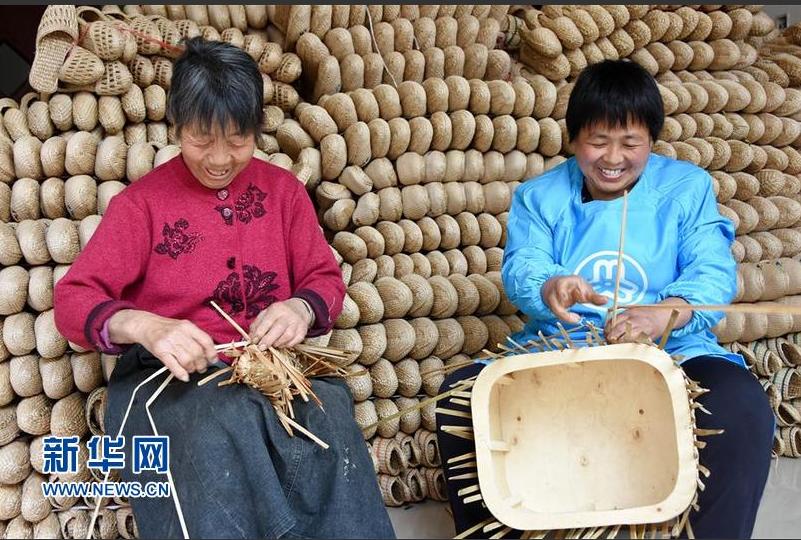 4月13日,山东省高青县高城镇姚套村农妇在制作草编工艺品。目前,山东省高青县高城镇姚套村有300多名农妇从事草编工艺品制作。村民利用黄河岸边涝洼地的香蒲草作为原料,编制草鞋、蒲垫、草提篮、锅盖、糖果盒等100多个花色品种,产品不仅畅销国内,还远销美国、澳大利亚、新加坡等国家和地区,每年创汇300余万元。如今,当地农民正在积极探索利用电商拓宽销售渠道。新华社记者 周科 摄