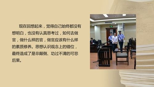 认识错位,从是非不明到功罪不清。我自幼生活在农村,父亲早前去世,家庭艰难贫穷。从小的理想就是当官、挣钱、过好日子。现在回想起来,觉得自己始终都没有想明白,也没有认真思考过,如何去做官,做什么样的官,做官应该有什么样的素质修养。在组织的培养下,我发展为中层干部,但自己却一直盲目地认为是自身的努力,缺少对所任职岗位的服务责任意识,从思想认识观念上一直摆不正自己与党组织、个人与社会群众、领导者与单位集体的关系,最终造成了是非颠倒、功过不清的可悲后果。
