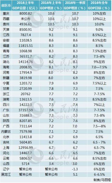 与一季度数据相比,上半年13省区市GDP增速加快,其中,新疆二季度提速最快,同比增长8.0%,增速比一季度加快1.1个百分点,提高幅度位居全国第一位;8省区市GDP增速略有减缓,其中,海南下滑最多,一季度,海南省的GDP增速为9.7%,而上半年的整体数据为8.1%,不过,依然比该省年初制定的7.0-7.5%的预期增速目标高出不少。