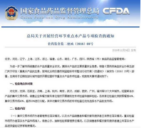 据国家食药监总局网站消息,国家食药监总局近日发出通知,在北京、河北、辽宁、上海、江苏、浙江、福建、山东、湖北、广东、四川、陕西省等省市开展经营环节重点水产品专项检查。