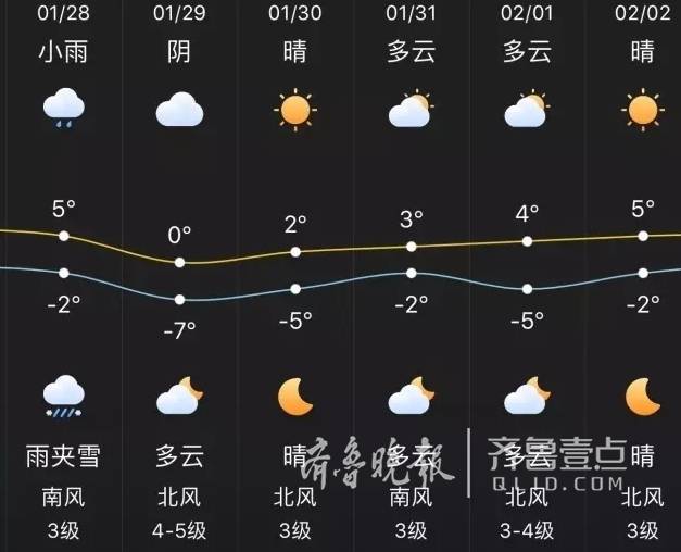 雨雪:预计28日(初一)白天,全省自南向北有小雨;28日夜间至29日白天,全省小雨转小雪,其中鲁中和半岛地区局部中雪。全省平均降水量5~10毫米。