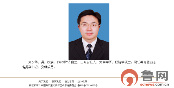 鲁网2月21日讯(记者 范金鑫)据山东共青团网站“领导班子”介绍显示,刘少华,现任共青团山东省委副书记、党组成员。