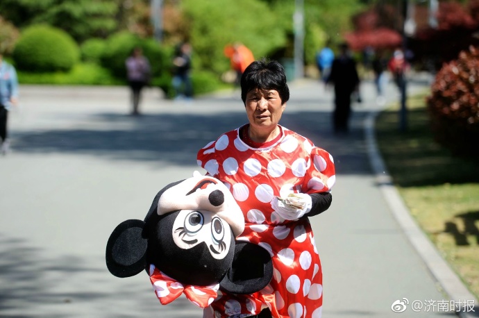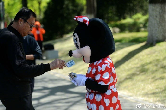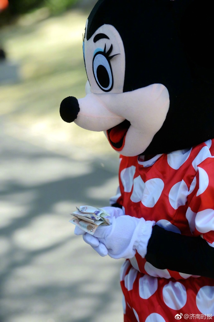 18日,在济南张庄路附近的森林公园里,一位老人身穿米老鼠的演出服,戴上厚重的面具,邀请过往的游客与其合影,同时向游客讲述家庭遭遇,为病床上的儿媳妇募集治疗费。