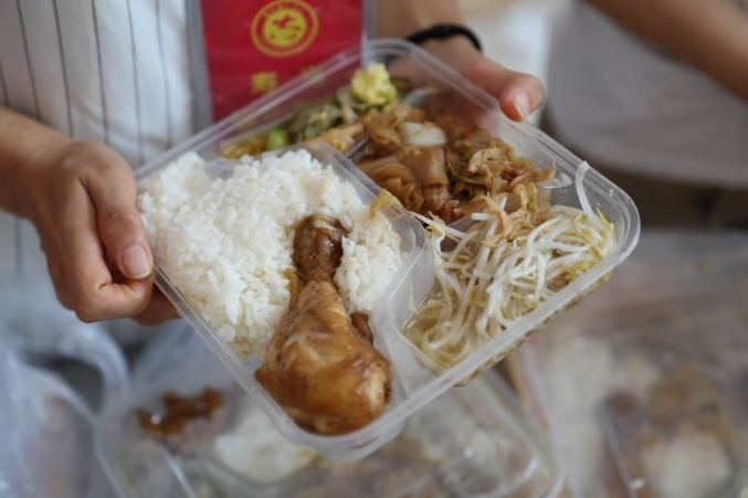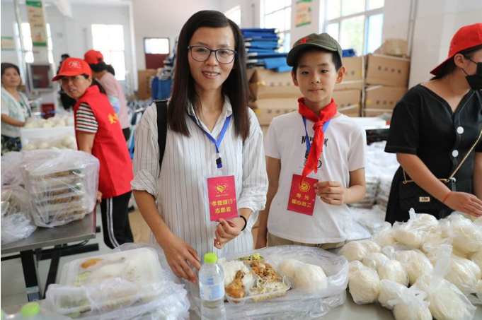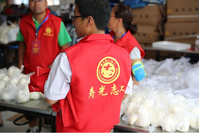 鲁网8月24日讯 营里镇第二初中安置点的社会公益服务人员。一人一份盒饭,两荤两素、鸡腿米饭……24日中午,记者来到寿光洪水灾区营里镇最大的一个安置点营里镇第二初级中学,恰逢安置点在分发午餐。