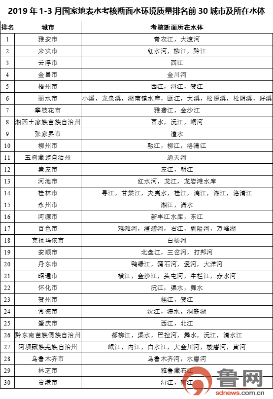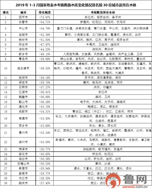 鲁网5月8日讯(记者 张铭芳)你居住的城市水质如何?5月7日,生态环境部向媒体通报2019年3月和1-3月全国地表水环境质量状况。其中,山东的青岛、日照、滨州、菏泽四市水环境质量变化情况相对较好。东营、潍坊位列水环境质量排名后30城市。