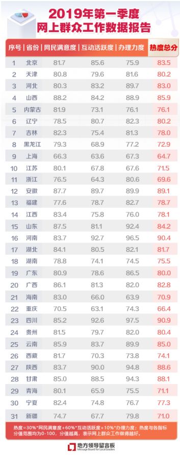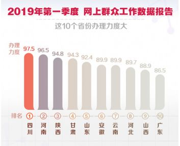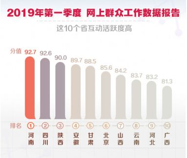 在这些数据的基础上,人民网《地方领导留言板》对网上群众工作数据报告进行了升级,将榜单细化为网民满意度、互动活跃度、办理力度3大方面、10项指标。通过对各地留言办理工作的综合分析,四川、河南、安徽、陕西、甘肃、山西、云南、山东、北京、河北位列全国前10名。