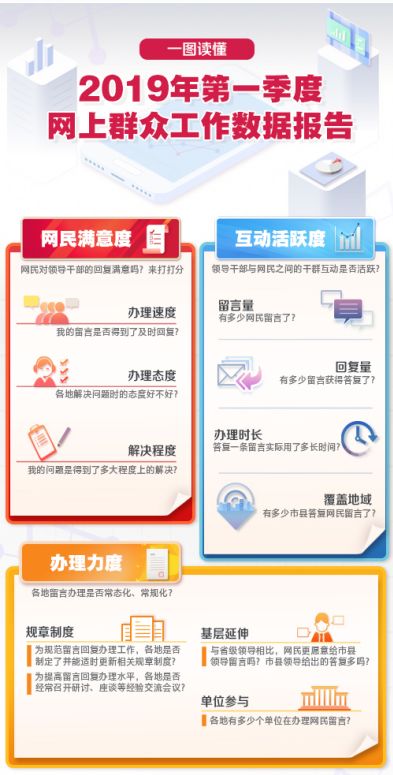 升级后的网上群众工作数据报告将网民评价作为各地网上群众工作的重要衡量标准。各地能否积极推动切实解决问题,在留言办理工作中是否能及时快速地作出回应,是否能耐心细致地进行线下沟通等,都影响着网民对留言办理工作的满意程度。