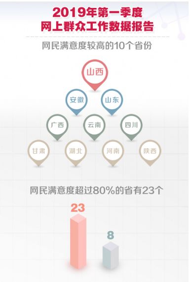 分析第一季度全部网民评价,有超过一半的网民结合各地办理结果给出了满意回复,有23个省的季度网民满意度超过80%。综合各方面因素,网民满意度位居前10的省份依次是山西、安徽、山东、广西、云南、四川、甘肃、湖北、河南、陕西。