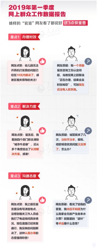 “金杯银杯不如老百姓的口碑”,近年来各地深入开展网上群众工作,网民参与网上干群互动的积极性,尤其是参与点评、点赞的人数明显提升。在2019年第一季度中,有近万名网民给各地网民留言办理工作点赞,表示满意的网民人数与去年同期相比增长了150%。