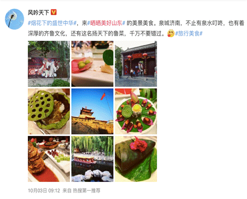 #晒晒美好山东#话题中虽然有网友将聚焦在电影,不过国庆假期,话题中,齐鲁美食、美景分享依然抢镜。“泉城济南,不止有泉水叮咚,也有着深厚的齐鲁文化,还有这名扬天下的鲁菜,千万不要错过”@风吟天下分享道。