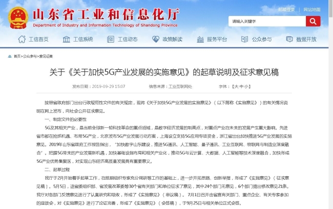 鲁网10月6日讯(记者赵嘉伟)9月29日,山东省工业和信息化厅发布《关于加快5G产业发展的实施意见》征求意见稿,向社会公开征求意见。全文如下。