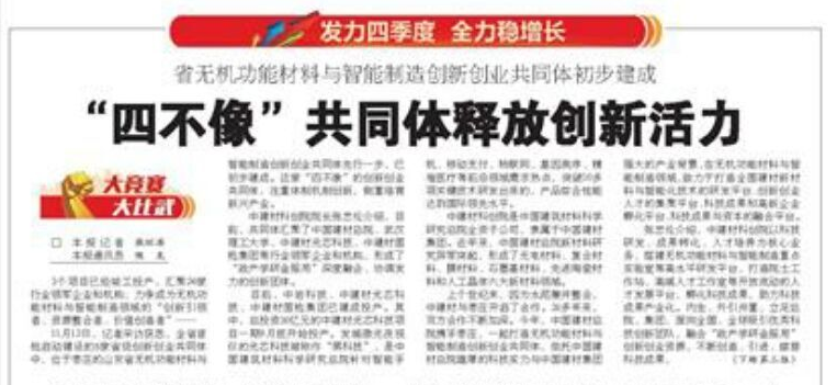“四不像”共同体释放创新活力。11月24日,大众日报在头版重要位置刊发文章,报道了山东首批启动建设的5家省级创新创业共同体,其中位于枣庄的山东省无机功能材料与智能制造创新创业共同体先行一步,已初步建成。这家“四不像”的创新创业共同体,汇聚了中国建材总院、武汉理工大学、中建材光芯科技、中建材国检集团等行业领军企业和机构,形成了“政产学研金服用”深度融合、协调发力的创新团体,3个项目已经竣工投产,力争成为无机功能材料与智能制造领域的“创新引领者、资源整合者、价值创造者”。