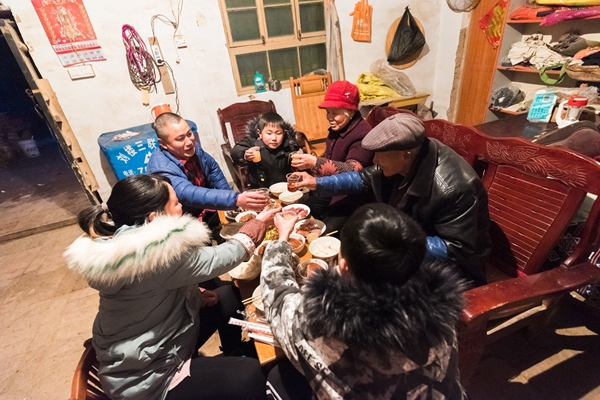 天色渐黑,今年刘进涛家的年夜饭既有祖辈传承下来的地方名吃“蒸碗”,也有现包现下的新鲜水饺。爆竹声声,辞旧迎新,儿子刘胜平端起了酒杯:“下一年咱就上新村台、新房子,新年快乐!”