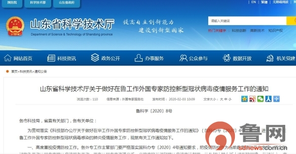 鲁网2月3日讯(记者 范金鑫)2月3日,山东省科学技术厅网站发布《山东省科学技术厅关于做好在鲁工作外国专家防控新型冠状病毒疫情服务工作的通知》(以下简称《通知》),要求在宣传引导、疫情排查、业务办理等方面,进一步做好在鲁工作外国专家防控新型冠状病毒感染的肺炎疫情服务工作。
