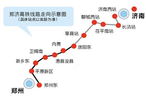 郑济高速铁路,又名济郑客运专线,简称郑济高铁、郑济客专,是河南省与山东省规划建设的一条高速铁路干线,起自郑州东站,止于济南西站,是河南省“米”字形高铁网络战略的重要组成部分,也是山东“四横六纵”综合运输通道的组成部分。郑州至济南铁路山东段正线全长170公里,共设车站5座,分别为接轨站济南西站、长清站、茌平南站、聊城西站和莘县站。