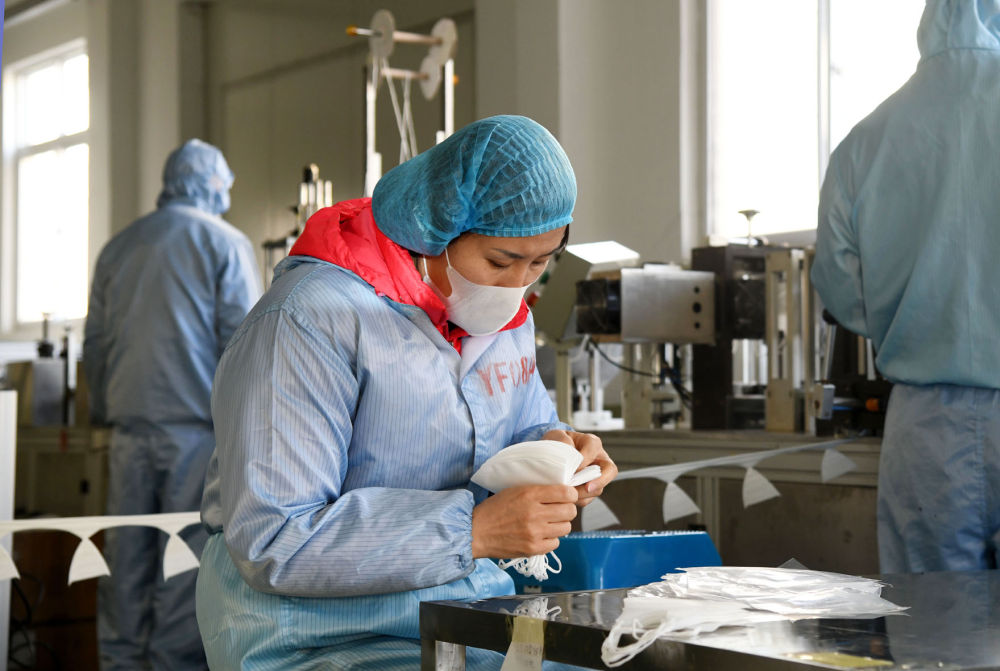 青岛明月生物医用材料公司工人正在车间内生产口罩。(新华社记者 王凯 摄)