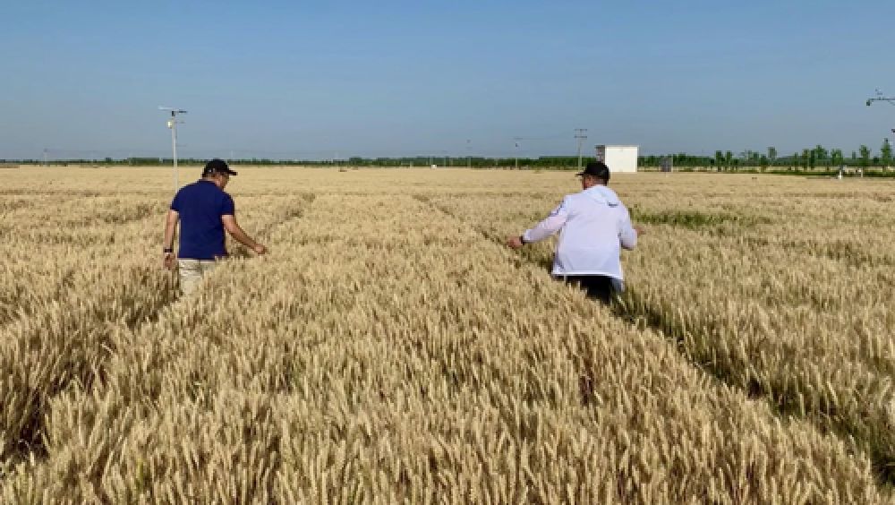 小麦收获前,山东齐力新农业服务有限公司经理李朝刚(右一)与山东农业大学农学院副教授陈国庆(左一)一同下地查看小麦生长情况。
