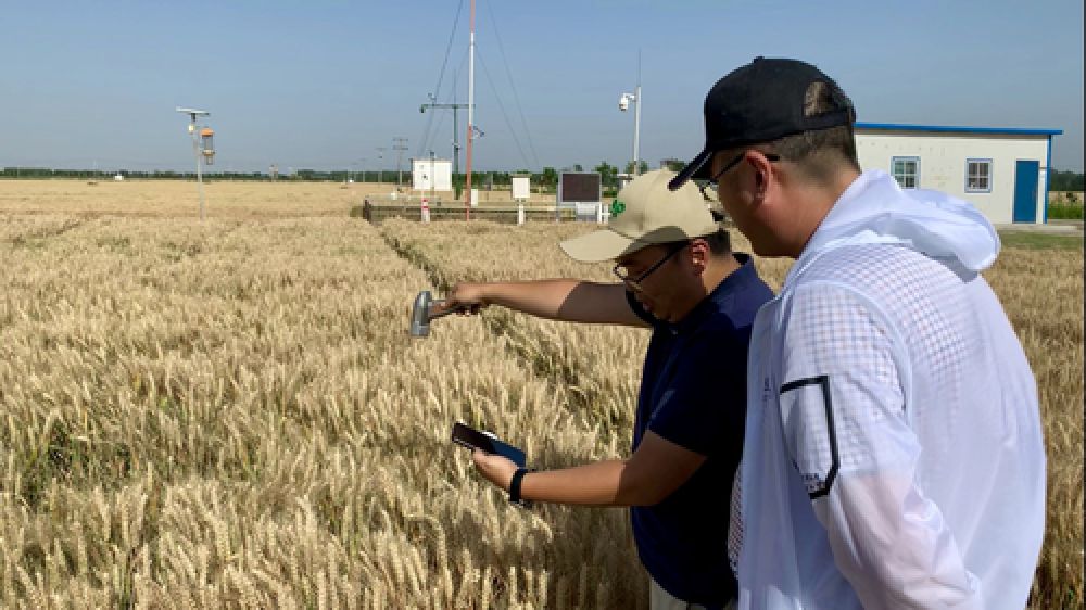 小麦收获前,山东齐力新农业服务有限公司经理李朝刚(右一)与山东农业大学农学院副教授陈国庆(左一)用手持多光谱设备检测小麦养分数据。