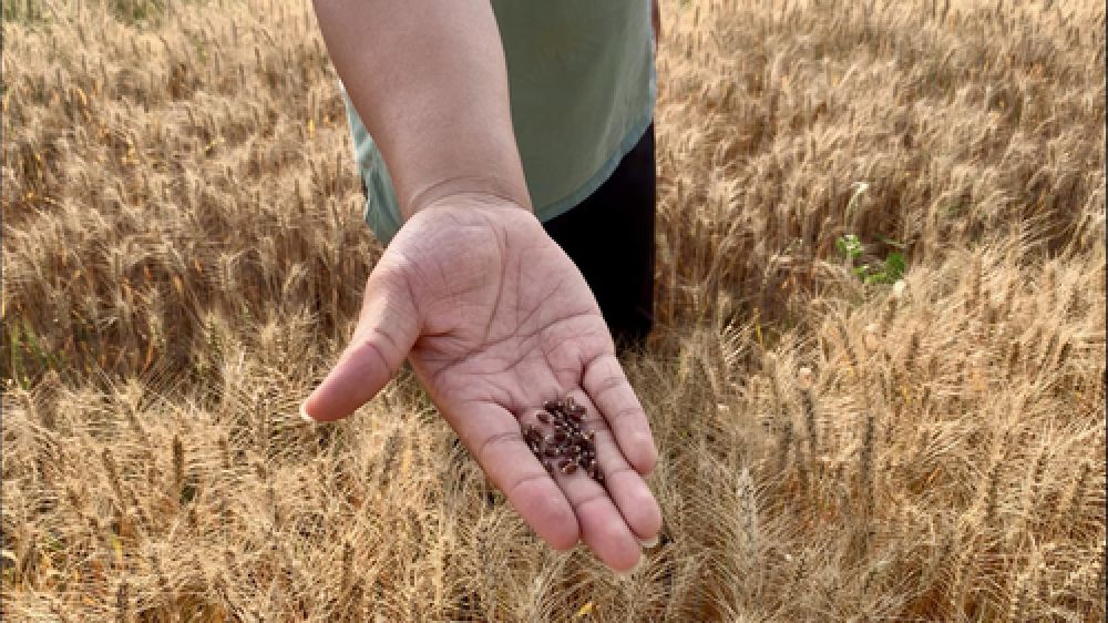 6月5日,山东省德州市平原县鲁望生态农业发展有限公司农场主孟程程给记者展示黑小麦的麦粒。