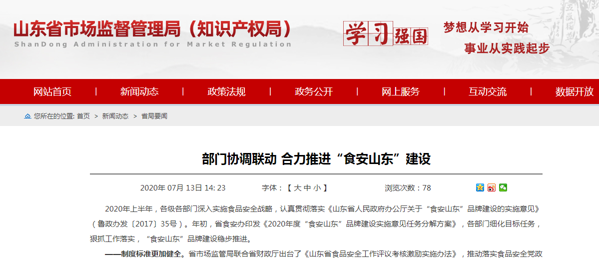 鲁网7月14日讯(记者 赵嘉伟) 近日,记者于山东省食安办获悉,2020年上半年,各级各部门深入实施食品安全战略,认真贯彻落实《山东省人民政府办公厅关于“食安山东”品牌建设的实施意见》(鲁政办发〔2017〕35号)。年初,省食安办印发《2020年度“食安山东”品牌建设实施意见任务分解方案》,各部门细化目标任务,狠抓工作落实,“食安山东”品牌建设稳步推进。