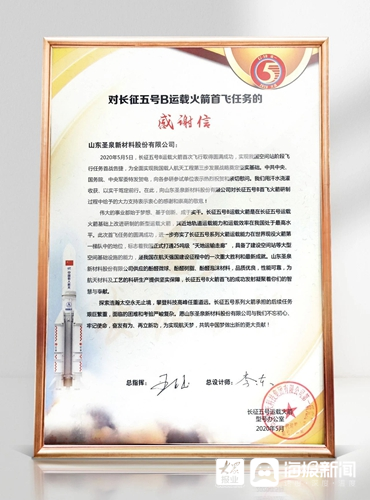 2020年5月5日,我国长征五号B运载火箭首次飞行取得圆满成功。很快,山东济南的一家新材料民营企业收到了长征五号运载火箭型号办公室发来的感谢信。