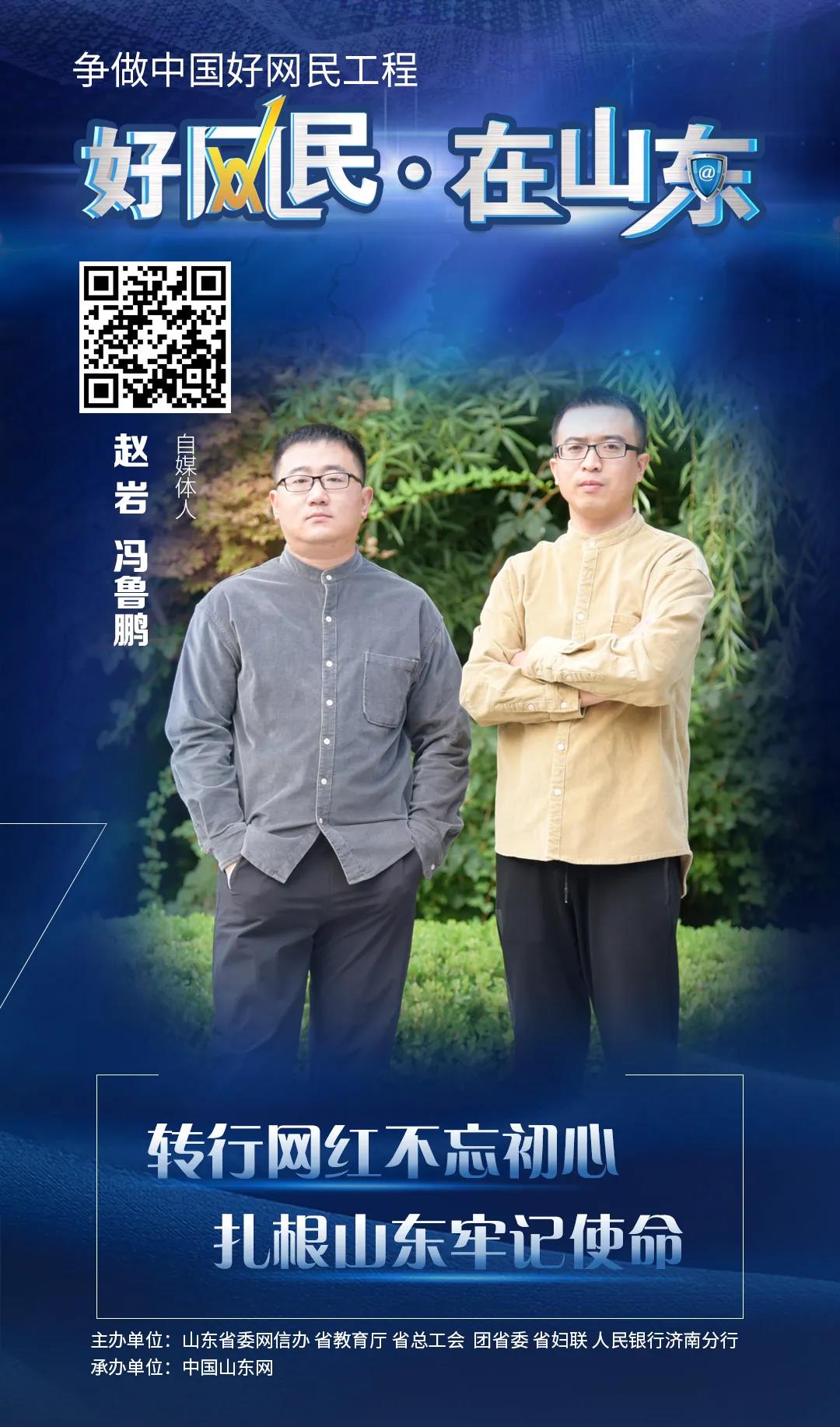 赵岩和冯鲁鹏,在传统电视台媒体工作近十年,2019年,两人离开传统媒体平台,加入自媒体的浪潮。2020年初,赵岩和冯鲁鹏一起创立自媒体账号“秀才侃娱乐”“鲁生可畏”,在全网已有五百多万粉丝,成了“网红”“大V”“主播”。他们用无偿直播带货的方式,助力山东本土企业复工复产,积极参与助农项目。他们一直立足山东、扎根山东、心系山东,为父老乡亲添柴助力,为故乡发展贡献力量。